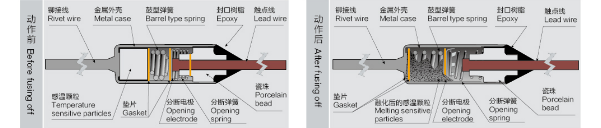 Wenn die Umgebungstemperatur die Betriebstemperatur überschreitet, schmelzen die empfindlichen Partikel durch die Hitze des Anschlusskabels. In diesem Zustand wird die Öffnungsfeder auseinandergezogen und die elastische Kraft drückt die Elektrode an die Feder, um die Verbindung mit dem Anschlusskabel zu unterbrechen. Der Strom wird ebenfalls unterbrochen.